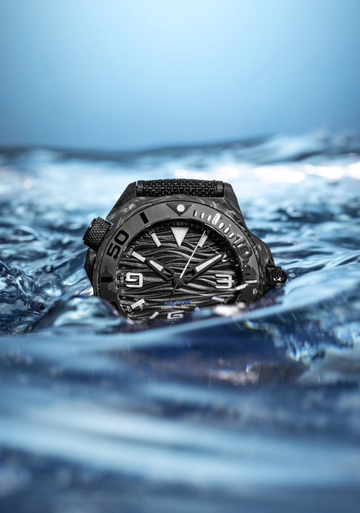 超軽量のカーボンファイバーケースを採用し、わずか90gという驚きの軽さを実現。しなやかさと強さを兼ね備えた仕上がりです。さらに、この時計には、実在するマンタ「まぎー」の物語が込められています。文字盤に描かれた波模様は、まぎーが泳ぐ黒潮の力強い流れを表現しています。