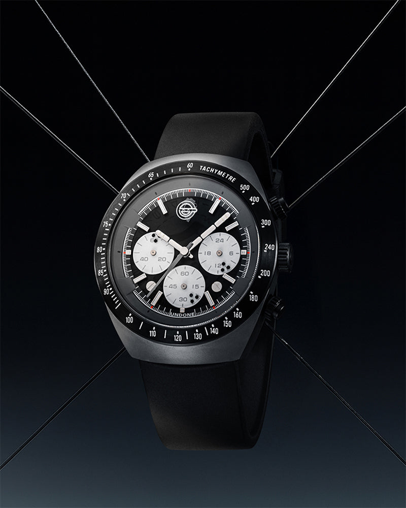 316Lステンレススチール製のケースはタチコマのボディと合わせたカラー、ダイアルはタチコマの3つのアイボールをトリコンパックスで再現したデザインになっています。アンテナ部分とアーム指先をイメージした時分針と秒針、攻殻S.A.C.のコアとなる『笑い男』と『公安九課』のマークが刻まれている等、細部までこだわりました。また、ケースバックにはタチコマグレーの機体がさりげなく存在感を放ちます。